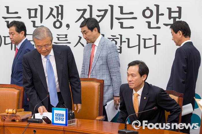 (서울=포커스뉴스) 김종인(왼쪽 두 번째) 더불어민주당 비상대책위 대표와 우상호(왼쪽 네 번째) 원내대표를 비롯한 비상대책위원들이 8일 오전 서울 여의도 국회에서 열린 비상대책위원회의에 참석하기 위해 회의실로 들어서고 있다.