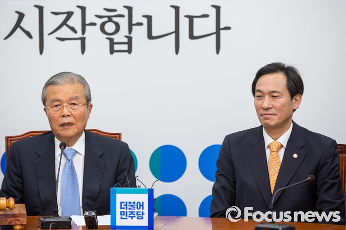 (서울=포커스뉴스) 김종인(왼쪽) 더불어민주당 비상대책위 대표가 8일 오전 서울 여의도 국회에서 열린 비상대책위원회의에 참석해 모두발언 하고 있다.