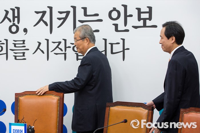 (서울=포커스뉴스) 김종인(왼쪽) 더불어민주당 비상대책위 대표와 우상호 원내대표가 8일 오전 서울 여의도 국회에서 열린 비상대책위원회의에 참석하기 위해 회의실로 들어서고 있다.