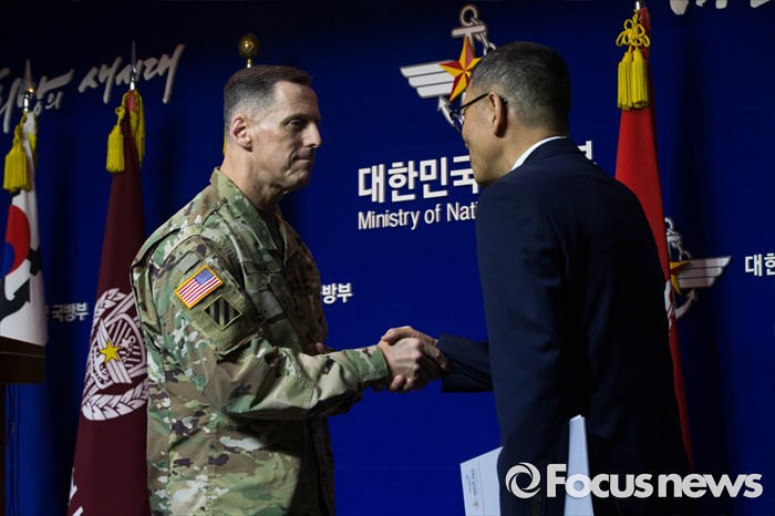 (서울=포커스뉴스) 8일 오전 서울 용산구 국방부 브리핑실에서 류제승 국방부 국방정책실장(오른쪽)과 토머스 벤달 주한미군 8군 사령관(왼쪽)이 주한미군 사드(THAAD) 배치 결정과 주한민국의 사드 배치 가능성에 대한 공식협의 개시를 발표한 후 악수를 하고 있다.
