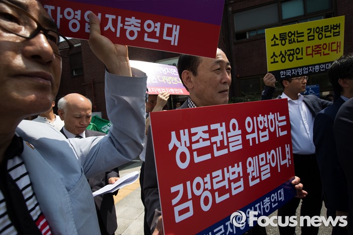 (서울=포커스뉴스) 한국자영업자총연대 등 소상공인 단체가 8일 오전 서울 종로구 효자동주민센터 앞에서 김영란법 시행 저지와 중소상공인 자영업자 발전대책 촉구 공동 기자회견을 하고 있다.