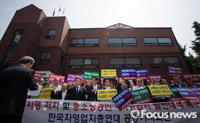 (서울=포커스뉴스) 한국자영업자총연대 등 소상공인 단체가 8일 오전 서울 종로구 효자동주민센터 앞에서 김영란법 시행 저지와 중소상공인 자영업자 발전대책 촉구 공동 기자회견을 하고 있다.
