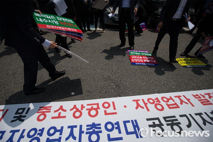 (서울=포커스뉴스) 한국자영업자총연대 등 소상공인 단체가 8일 오전 서울 종로구 효자동주민센터 앞에서 김영란법 시행 저지와 중소상공인 자영업자 발전대책 촉구 공동 기자회견을 하고 있다.