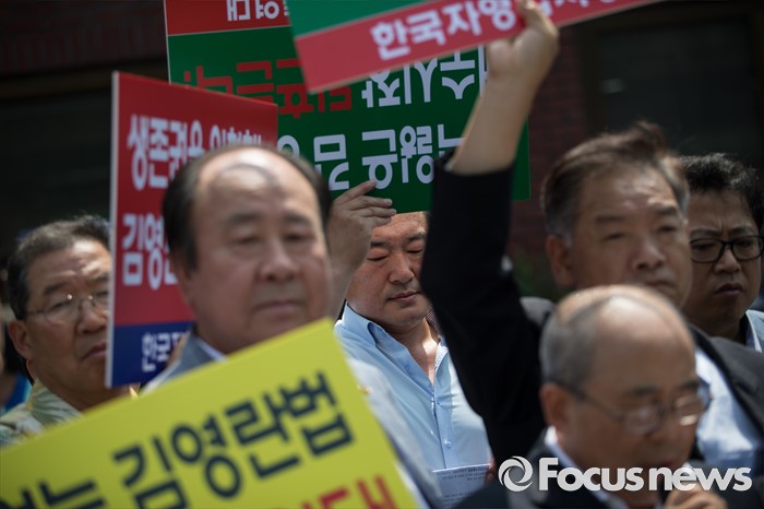 (서울=포커스뉴스) 한국자영업자총연대 등 소상공인 단체가 8일 오전 서울 종로구 효자동주민센터 앞에서 김영란법 시행 저지와 중소상공인 자영업자 발전대책 촉구 공동 기자회견을 하고 있다.
