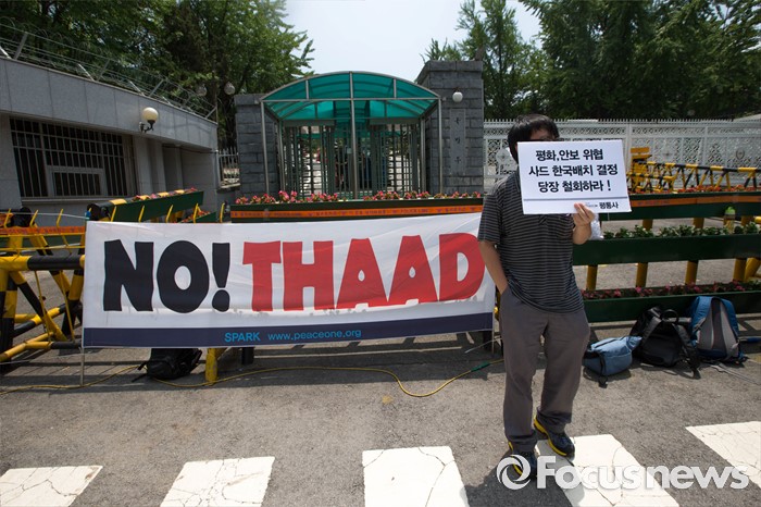 (서울=포커스뉴스) 국방부가 사드의 한국 배치를 결정한 8일 오후 서울 용산구 국방부 앞에서 사드 한국 배치를 규탄하는 평화와 통일을 여는 사람들 관계자들의 시위가 열리고 있다.