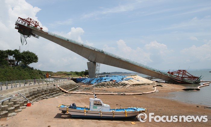 (영광=포커스뉴스) 8일 오전 전남 영광군 염산면과 무안군 해제면을 잇는 칠산대교 건설현장에서 상판 구조물이 무너져 노동자 6명이 부상을 입는 사고가 발생, 칠산대교는 가운데 교각을 중심으로 상판이 한쪽으로 기울듯 무너져 내려 있다.