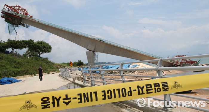 (영광=포커스뉴스) 8일 오전 전남 영광군 염산면과 무안군 해제면을 잇는 칠산대교 건설현장에서 상판 구조물이 무너져 노동자 6명이 부상을 입는 사고가 발생, 칠산대교는 가운데 교각을 중심으로 상판이 한쪽으로 기울듯 무너져 내려 있다.