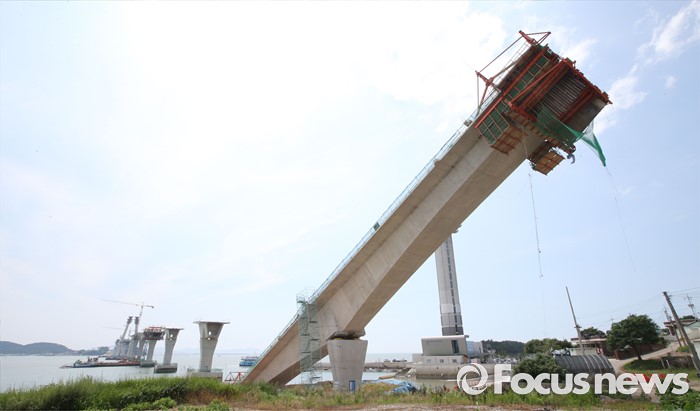 (영광=포커스뉴스) 8일 오전 전남 영광군 염산면과 무안군 해제면을 잇는 칠산대교 건설현장에서 상판 구조물이 무너져 노동자 6명이 부상을 입는 사고가 발생, 칠산대교는 가운데 교각을 중심으로 상판이 한쪽으로 기울듯 무너져 내려 있다.