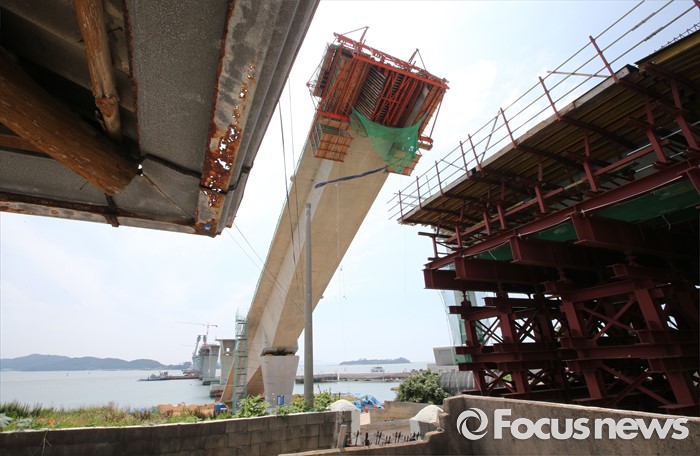 (영광=포커스뉴스) 8일 오전 전남 영광군 염산면과 무안군 해제면을 잇는 칠산대교 건설현장에서 상판 구조물이 무너져 노동자 6명이 부상을 입는 사고가 발생, 칠산대교는 가운데 교각을 중심으로 상판이 한쪽으로 기울듯 무너져 내려 있다.