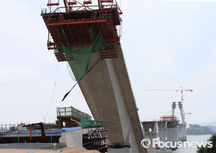 (영광=포커스뉴스) 8일 오전 전남 영광군 염산면과 무안군 해제면을 잇는 칠산대교 건설현장에서 상판 구조물이 무너져 노동자 6명이 부상을 입는 사고가 발생, 칠산대교는 가운데 교각을 중심으로 상판이 한쪽으로 기울듯 무너져 내려 있다.