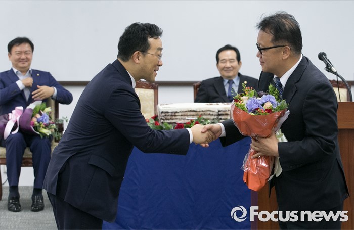(서울=포커스뉴스) 8일 오후 서울 여의도 국회도서관에서 열린 국회입법조사처 입법조사요구 4만건 돌파 기념식에 참석한 임성호(왼쪽) 국회입법조사처장이 입법조사 회답 4만 번째 주인공인 민병두 더불어민주당 의원에게 꽃다발을 전하고 있다.