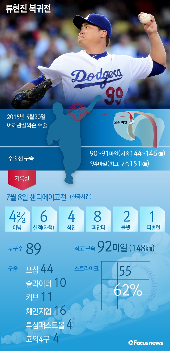 LA다저스 로버츠 감독은 경기후 "류현진의 선발 등판 자체가 '승리'"라며 "류현진이 단지 피곤해서 예전보다 빠른 공을 던지지 못한 것이다. 다음 등판에서는 더 좋은 모습을 보여주리라 확신한다"고 말했다.(서울=포커스뉴스) 류현진은 8일(한국시간) 미국 캘리포니아주 LA 다저스타디움에서 열린 샌디에이고와의 경기에 선발투수로 마운드에 올랐다. 류현진은 이날 4와 3분의 2이닝 4삼진 8피안타 6실점을 기록했다. 이날 최고 구속은 92마일(약 148㎞)로 수술 전 구속으로 거의 회복했다. 2016.07.08 김일환 기자 (LA/미국=게티/포커스뉴스) 류현진은 8일(한국시간) 미국 캘리포니아주 LA 다저스타디움에서 열린 샌디에이고와의 경기에 선발투수로 마운드에 올라 투구하고 있다. 2016.07.08 ⓒ게티이미지/이매진스 (LA/미국=게티/포커스뉴스) 류현진이 8일(한국시간) 미국 캘리포니아주 LA 다저스타디움에서 열린 샌디에이고와의 경기에 선발투수로 출전해 실점에 아쉬워하고 있다. 2016.07.08 ⓒ게티이미지/이매진스
