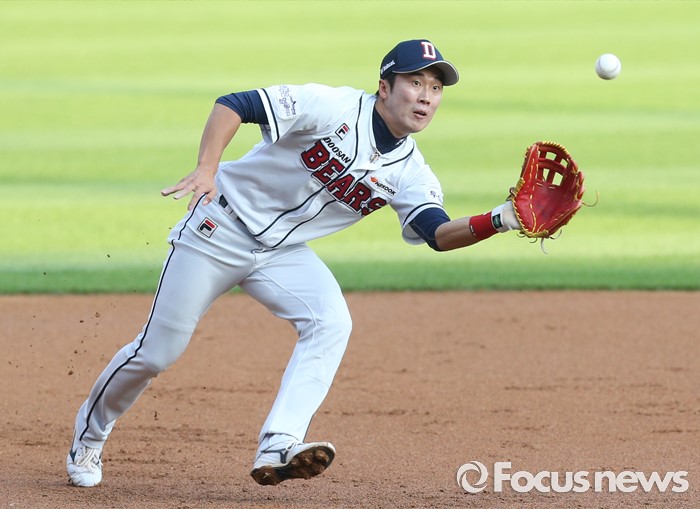 (서울=포커스뉴스) 8일 서울 잠실구장에서 열린 2016 프로야구 KIA-두산 경기 1회초 1사 1루에서 두산 3루수 허경민이 KIA 김주찬의 타구를 잡고 있다.