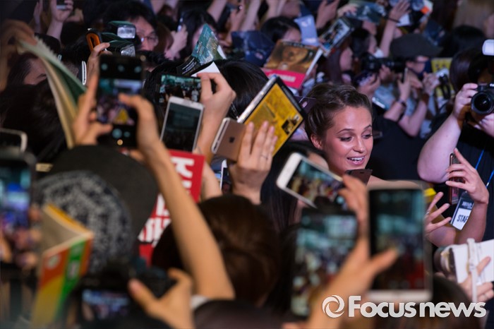 (서울=포커스뉴스) 8일 오후 서울 영등포구 타임스퀘어에서 열린 영화 '제이슨 본' 레드카펫 행사에 참석한 배우 알리시아 비칸데르가 팬들과 함께 사진을 찍고 있다.