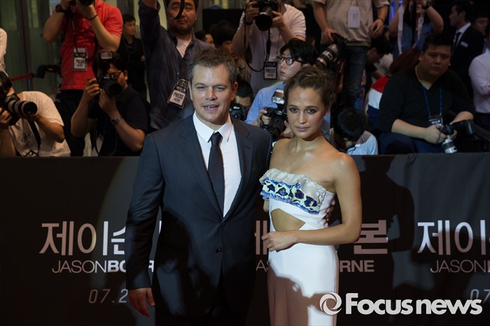 (서울=포커스뉴스) 8일 오후 서울 영등포구 타임스퀘어에서 열린 영화 '제이슨 본' 레드카펫 행사에 참석한 배우 맷 데이먼(왼쪽)과 알리시아 비칸데르가 포즈를 취하고 있다.