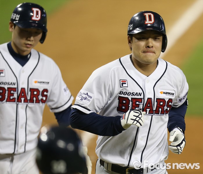 (서울=포커스뉴스) 8일 서울 잠실구장에서 열린 2016 프로야구 KIA-두산 경기 8회말 1사 2루에서 두산 민병헌이 우월 2점 홈런을 치고 홈인하고 있다.
