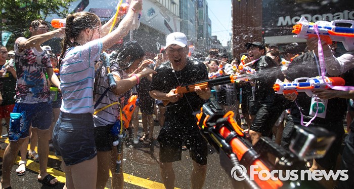 (서울=포커스뉴스) 9일 오후 서울 서대문구 신촌 연세로에서 열린 '2016 물총축제' 에 참가한 시민들이 서로 물총을 쏘며 즐거운 시간을 보내고 있다.