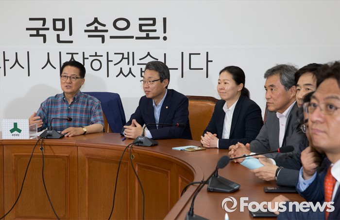 (서울=포커스뉴스) 박지원(왼쪽) 국민의당 비상대책위원장이 10일 오후 서울 영등포구 국회에서 열린 선관위의 편파적 행위에 대한 대책 회의 시작 전 국민의당 의원들과 대화하고 있다.