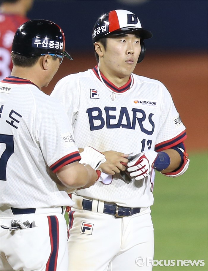 (서울=포커스뉴스) 10일 서울 잠실구장에서 열린 2016 프로야구 KIA-두산 경기 7회말 1사 1루에서 두산 허경민이 우익선상으로 빠지는 3루타를 치고 3루에서 장갑을 벗고 있다.