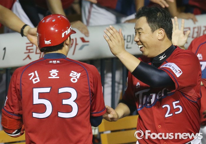 (서울=포커스뉴스) 10일 서울 잠실구장에서 열린 2016 프로야구 KIA-두산 경기 7회초 KIA 이범호가 덕아웃에서 홈런을 치고 들어오는 김호령을 활짝 웃으며 반기고 있다.