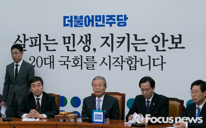 (서울=포커스뉴스) 11일 오전 서울 여의도 국회에서 열린 더불어민주당 비상대책위원회의에 참석한 김종인(오른쪽 세번재) 비대위 대표가 모두발언을 하고 있다.