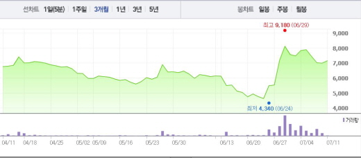 뉴프라이드는 11일 오전 9시48분 현재 전 거래일 대비 2.29%(160원) 상승한 7160원에 거래되고 있다. 뉴프라이드는 6일부터 8일까지 1~5%의 낙폭을 기록했다.