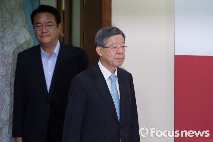 (서울=포커스뉴스) 김희옥(오른쪽) 새누리당 혁신비상대책위원장과 정진석 새누리당 원내대표가 11일 오전 서울 여의도 새누리당사에서 열린 혁신비상대책위원회의에 참석하기 위해 회의실로 들어서고 있다.
