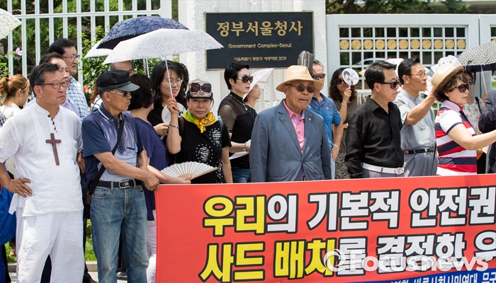 (서울=포커스뉴스) 11일 오전 서울 종로구 정부서울청사 정문 앞에서 열린 사드 배치 환영 기자회견에 참석한 보수단체 회원들이 더위에 지친 기색을 보이고 있다.