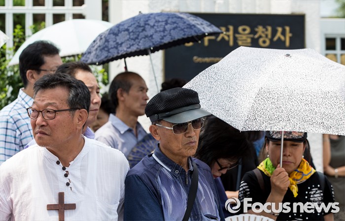 (서울=포커스뉴스) 11일 오전 서울 종로구 정부서울청사 정문 앞에서 열린 사드 배치 환영 기자회견에 참석한 보수단체 회원들이 더위에 지친 기색을 보이고 있다.