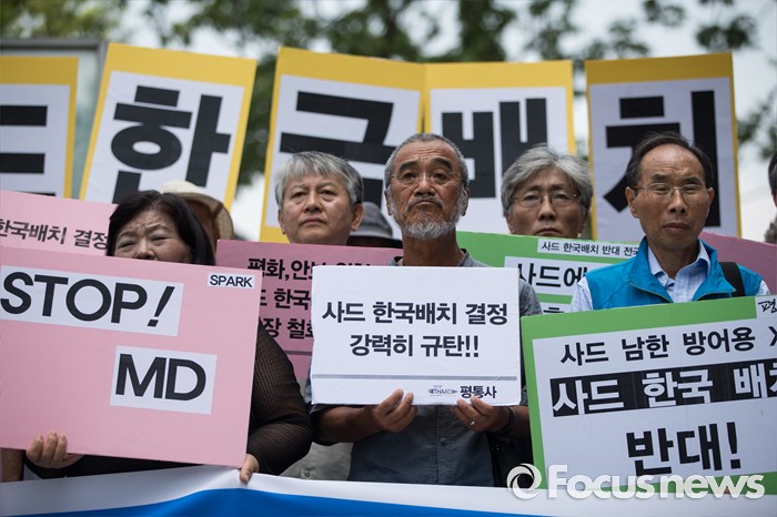 (서울=포커스뉴스) 문규현(가운데) 신부가 '평화와 통일을 여는 사람들' 관계자와 함께 11일 오전 서울 종로구 창조경제혁신센터 앞에서 사드 한국 배치 결정 철회 촉구 기자회견을 하고 있다.