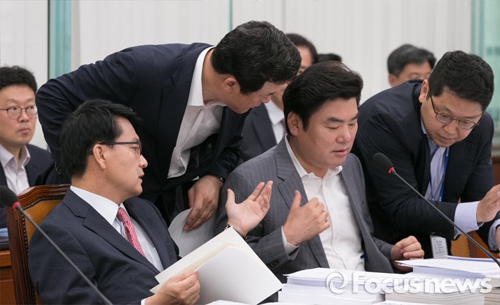 (서울=포커스뉴스) 11일 오전 서울 여의도 국회에서 열린 외교통일위원회 전체회의에 참석한 윤상현(왼쪽부터), 윤영석, 원유철 새누리당 의원이 대화하고 있다.