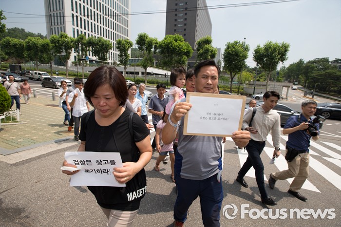(서울=포커스뉴스) 11일 오전 서울 서초구 대검찰청 앞에서 사건의 피해자와 유가족들이 '삼례 나라슈퍼 3인조 강도치사 사건' 진정서 제출 기자회견을 마친 뒤 진정서를 들고 대검으로 향하고 있다.
