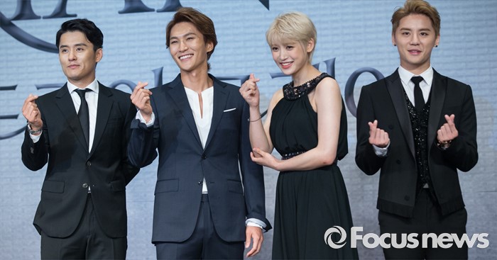(서울=포커스뉴스) 11일 오후 서울 종로구 포시즌스호텔 서울에서 열린 뮤지컬 '도리안 그레이' 제작발표회에 참석한 배우 최재웅(왼쪽부터), 박은태, 홍서영, 김준수가 포토타임을 갖고 있다.