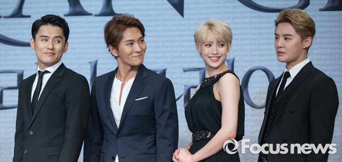 (서울=포커스뉴스) 11일 오후 서울 종로구 포시즌스호텔 서울에서 열린 뮤지컬 '도리안 그레이' 제작발표회에 참석한 배우 최재웅(왼쪽부터), 박은태, 홍서영, 김준수가 포토타임을 갖고 있다.