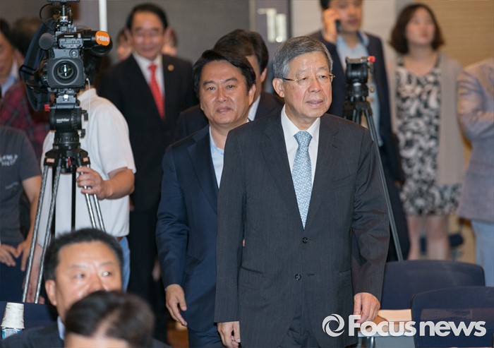 (서울=포커스뉴스) 11일 오후 서울 여의도 중소기업중앙회관에서 열린 새누리당 전국원외위원장협의회 전체회의에 김희옥(오른쪽) 혁신비대위원장과 이성헌 전국원외위원장협의회장이 참석하고 있다.