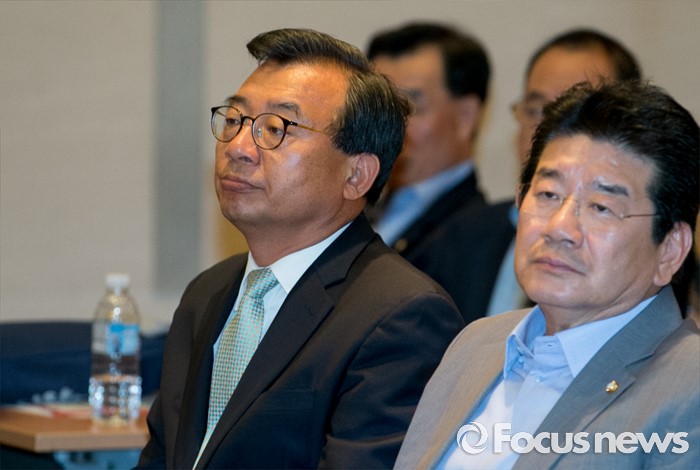 (서울=포커스뉴스) 11일 오후 서울 여의도 중소기업중앙회관에서 열린 새누리당 전국원외위원장협의회 전체회의에 전당대회 출마를 선언한 이정현(왼쪽), 강석호 의원이 주제발표를 듣고 있다.