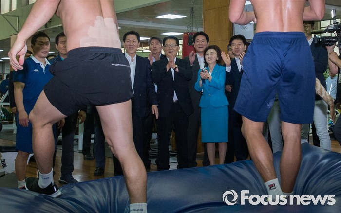(서울=포커스뉴스) 박지원 국민의당 비상대책위원장을 비롯한 주요 당직자들이 11일 오후 서울 노원구 태릉선수촌에 방문해 국가대표 선수들의 훈련을 지켜보며 박수치고 있다.