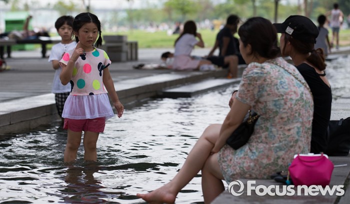 (서울=포커스뉴스) 올해 들어 첫 열대야가 발생한 11일 오후 서울 여의도 한강공원을 찾은 시민들이 더위를 피해 물놀이를 하고 있다.