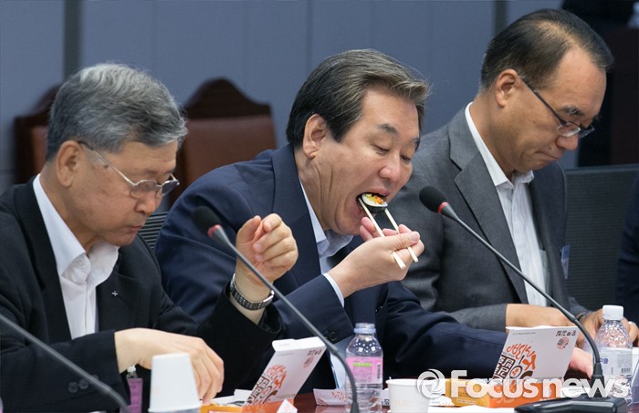 (서울=포커스뉴스) 12일 오전 서울 여의도 국회 의원회관에서 국가전략포럼 주최로 열린 국민이 바라는 개헌, 어떻게 할 것인가? 세미나에 참석한 김무성 새누리당 전 대표가 김밥을 먹고 있다.