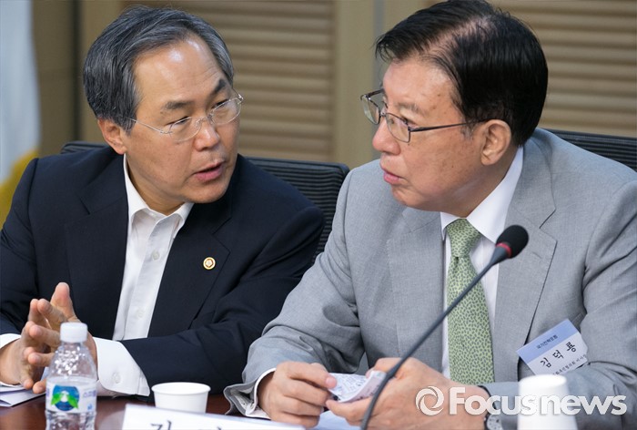 (서울=포커스뉴스) 12일 오전 서울 여의도 국회 의원회관에서 국가전략포럼 주최로 열린 국민이 바라는 개헌, 어떻게 할 것인가? 세미나에 참석한 우윤근(왼쪽) 국회 사무총장과 김덕룡 민주화추진협의회 이사장이 대화하고 있다.