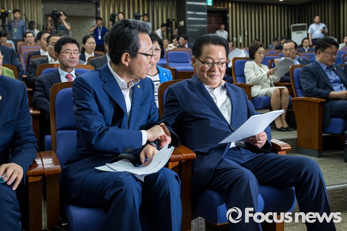 (서울=포커스뉴스) 박지원(오른쪽) 국민의당 비상대책위원장과 김성식 정책위의장이 12일 오전 서울 여의도 국회에서 열린 의원총회에 참석해 대화 하고 있다.