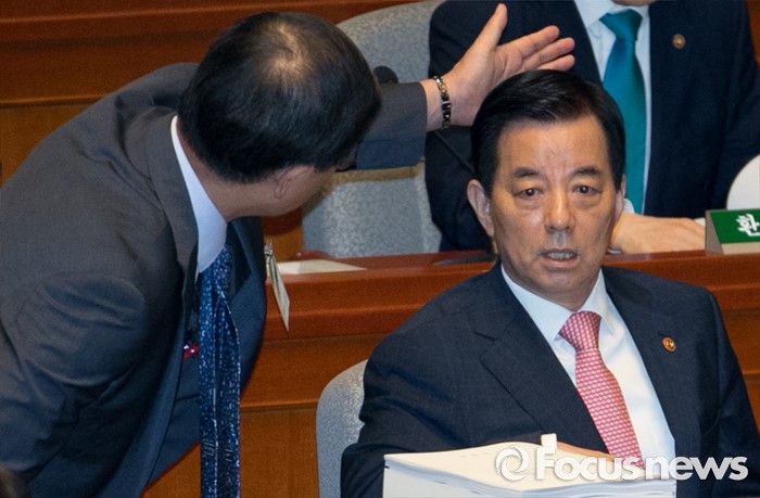 (서울=포커스뉴스) 12일 오전 서울 여의도 국회에서 2015회계연도 결산을 위해 열린 예산결산특별위원회 전체회의에 참석한 한민구(오른쪽) 국방부 장관이 관계자와 대화하고 있다.