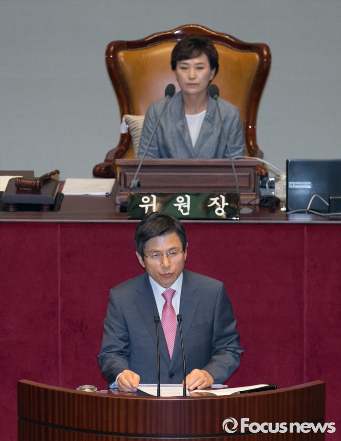 (서울=포커스뉴스) 12일 오전 서울 여의도 국회에서 2015회계연도 결산을 위해 열린 예산결산특별위원회 전체회의에 참석한 황교안 국무총리가 제안설명을 하고 있다.