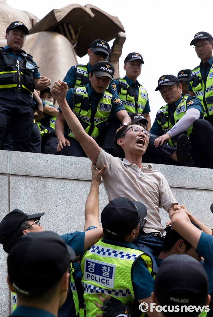 (서울=포커스뉴스) 12일 오전 서울 종로구 광화문광장 세종대왕 동상에서 최저임금 1만원 인상을 요구하며 시위를 하던 알바연대알바노조가경찰에게 연행되고 있다.