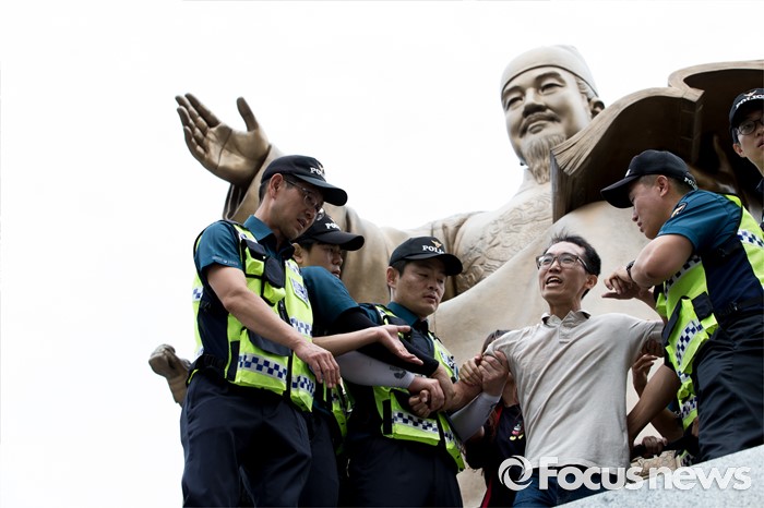 (서울=포커스뉴스) 12일 오전 서울 종로구 광화문광장 세종대왕 동상에서 알바연대알바노조가 최저임금 1만원 인상을 요구하며 기습시위를 벌이고 있다.