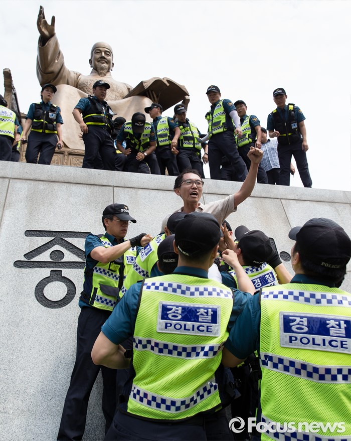 (서울=포커스뉴스) 12일 오전 서울 종로구 광화문광장 세종대왕 동상에서 최저임금 1만원 인상을 요구하며 시위를 하던 알바연대알바노조가경찰에게 연행되고 있다.