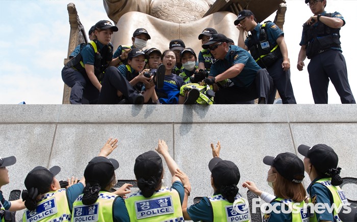 (서울=포커스뉴스) 12일 오전 서울 종로구 광화문광장 세종대왕 동상에서 최저임금 1만원 인상을 요구하며 시위를 하던 알바연대알바노조가경찰에게 연행되고 있다.