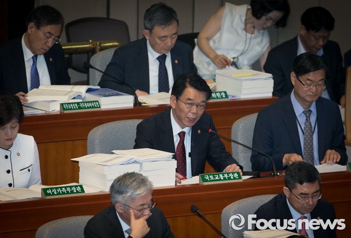 (서울=포커스뉴스) 12일 오전 서울 여의도 국회에서 2015회계연도 결산을 위해 열린 예산결산특별위원회 전체회의에 참석한 강호인 국토교통부 장관이 의원들의 질의에 답하고 있다.