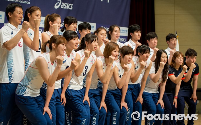 (진천=포커스뉴스) 12일 오전 충북 진천 선수촌 대강당에서 열린 '대한민국 여자배구 국가대표선수단 기자회견'에 참석한 이정철 감독, 코칭스태프 및 선수들이 포즈를 취하고 있다. 이날 기자회견을 가진 여자배구 선수단은 리우올림픽을 대비해 23일 네덜란드로 전지훈련을 떠날 계획이다.