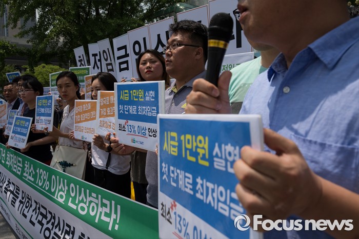 (서울=포커스뉴스) 경제정의실천시민연합 회원들이 12일 오후 서울 종로구 정부서울청사 앞에서 최저임금 인상 촉구 합동 기자회견을 하고 있다.
